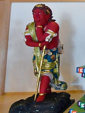 武将の姿をした神様で、勝利や財福をもたらすとされています。鎧兜を身につけ、宝塔を持ち、勇ましい姿です。