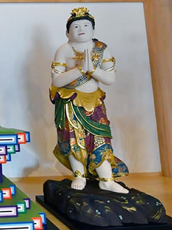 不動明王に仕(つか)える八大童子の中の一人で制吒迦童子と共に不動明王の脇士として不動明王の向って右側にお祀りされる。