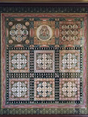 別名、「九会(くえ)曼荼羅」と呼ばれ、全体が九つの四角で構成されており、悟りの世界を九つの視点から考察し、表現したものである。