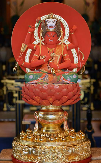 愛染明王は、宝瓶に活けられた蓮華座の上に、真赤な円相を光背にして結跏趺坐(けっかふざ)し、 頭部には獅子冠(ししかん)を頂き一面六臂三目(いちめんろっぴさんもく)の忿怒尊(ふんぬそん)であります。六本の手には、五鈷杵(ごこしょ)、五鈷鈴(ごこれい=息災)、弓矢(敬愛)、蓮華(根本無明を降伏)を持ち、台座の赤蓮華は敬愛、宝瓶は増益の徳を表しています。そして、六本の手は六道界全てを救う意であり、五鈷杵・五鈷鈴は金剛薩た、弓矢は金剛愛菩薩を象徴しているのであります。不動明王が胎蔵界を代表する明王であるならば、愛染明王は、金剛界を代表する明王であるといわれています。
