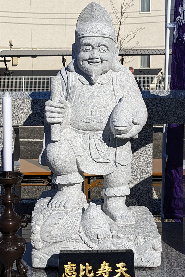 商売繁盛の神様として広く信仰されています。釣り竿と鯛を持ち、笑みを浮かべています。漁業や商売に携わる人々から特に崇められています。